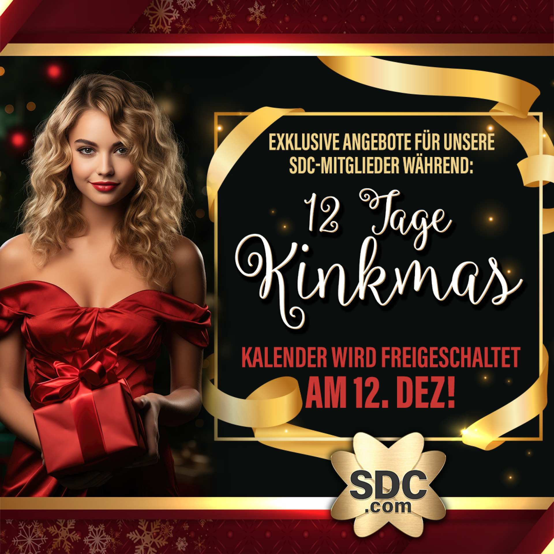 Dauer: 12.12. bis 24.12 Deine Weihnachtszeit wird jetzt noch sexyer – und kinkier! Auch wir von SDC machen unseren treuen Mitgliedern gerne Geschenke. Besuche ab dem 12. Dezember 2023 jeden Tag unseren Kinkmas-Kalender, um eine neue, exklusive Aktion von einem unserer Partner zu entdecken. Öffne jeden Tag ein Angebot und nimm automatisch an der Verlosung fantastischer Preise teil! Lass uns gemeinsam 12 Tage Kinkmas feiern!