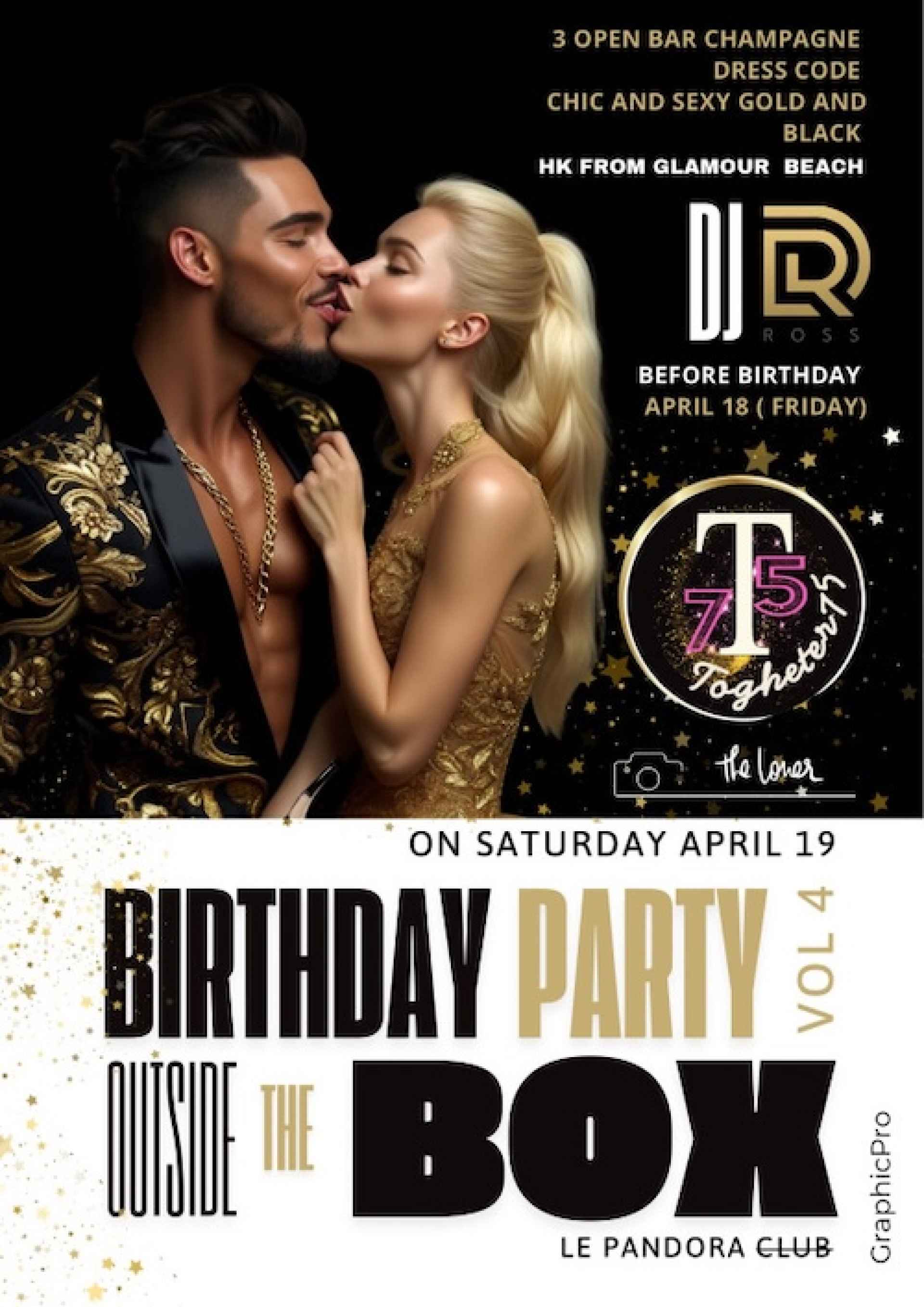 Vendredi 18 Avril, 2025 Lieu: Pandora Club, Paris (103 rue Marcadet, Paris) ? Horaires: 22h - 5h Privatisation exclusive du club Dress Code : Noir avec une touche d'or (T-shirts interdits) – Élégance et sensualité de rigueur Cette année encore, on fête mon putain d'anniversaire comme il se doit avec une soirée inoubliable où musique, ambiance et plaisir seront à leur comble! DJ Set par DJ D-Ross – Une playlist enflammée pour vous faire danser jusqu'à l'aube. Photos par The Loner – Le photographe sera là pour ceux qui veulent immortaliser l'instant. Performance exclusive de Hakim (HK) de Glamour Beach – Son show de percussions électrisant enflammera la nuit. ? 3 Flashs Open Bar Champagne: Premier flash à 23h pour mettre l'ambiance.