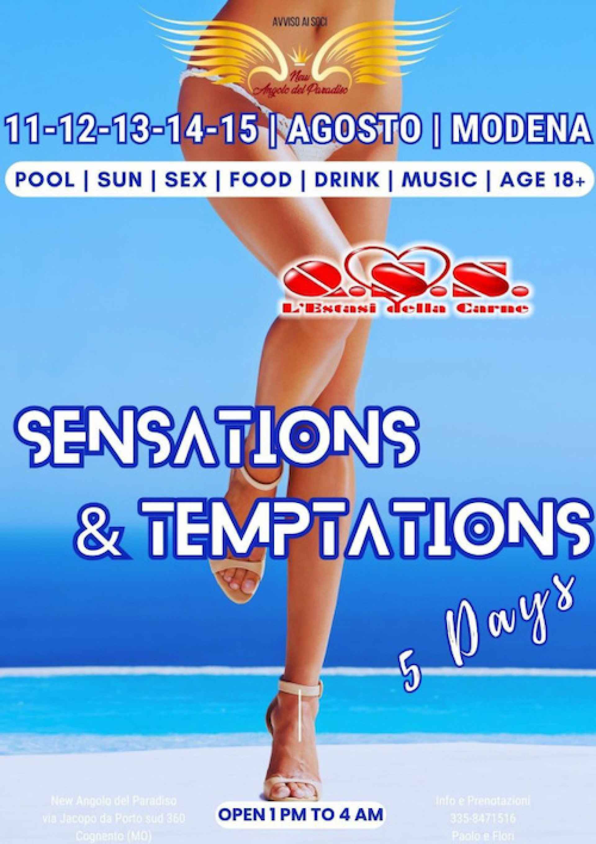 (i singoli giorni verranno pubblicati separatamente sul nostro sito web) Arrival & evento più atteso dell & estate... QSSS festa del 15 agosto! L’estate è magica, è magica, oh oh oh…L ‘estate è magica Devi immaginare, immagina oh oh oh.. L’estate è magica! QSS e i suoi amici vi aspettano per festeggiare un caldo ferragosto presso la bellissima villa & Angolo del Paradiso. Non una sola serata ma CINQUE: 5 notti e 5 giorni di trasgressione, divertimento e sensualità!