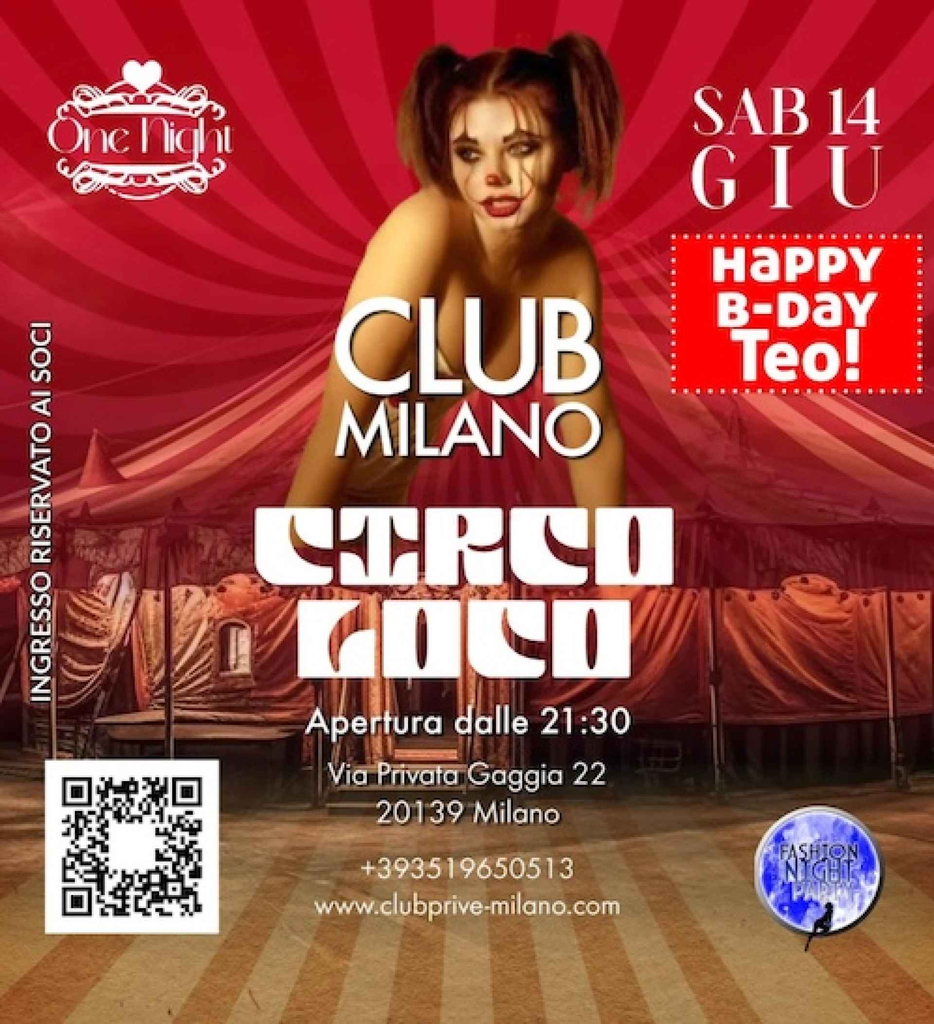 Sabato 14 giugno 2025 O N E N I G H T Circo Loco l’evento del mese più atteso .., sarà una serata pazzesca!