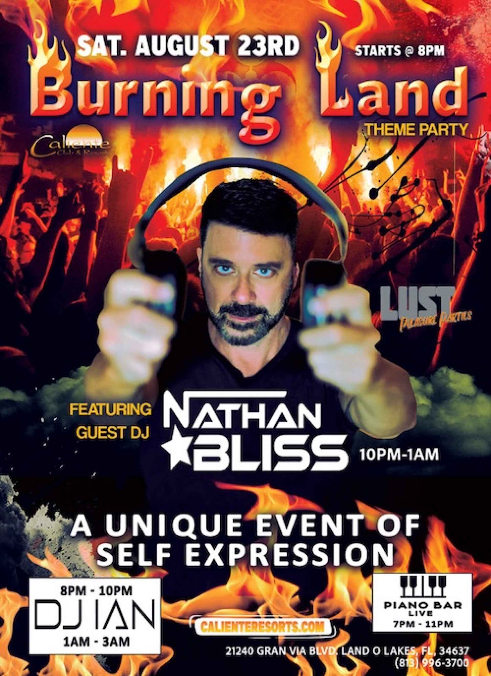 Saturday, August 23rd, 2025 8 PM Burning Man? Nah...Burning Land! Nathan Bliss brings a special night to Caliente...a unique night of self expression, amazing music, and unbelievable vibes. Burning Land takes place on Saturday, August 23. DJ Ian kicks things off at 8 PM with Nathan Bliss going live at 10 PM. Make this a night to never forget! Contact us for Day and Evening Passes or to Book a Room Overnight