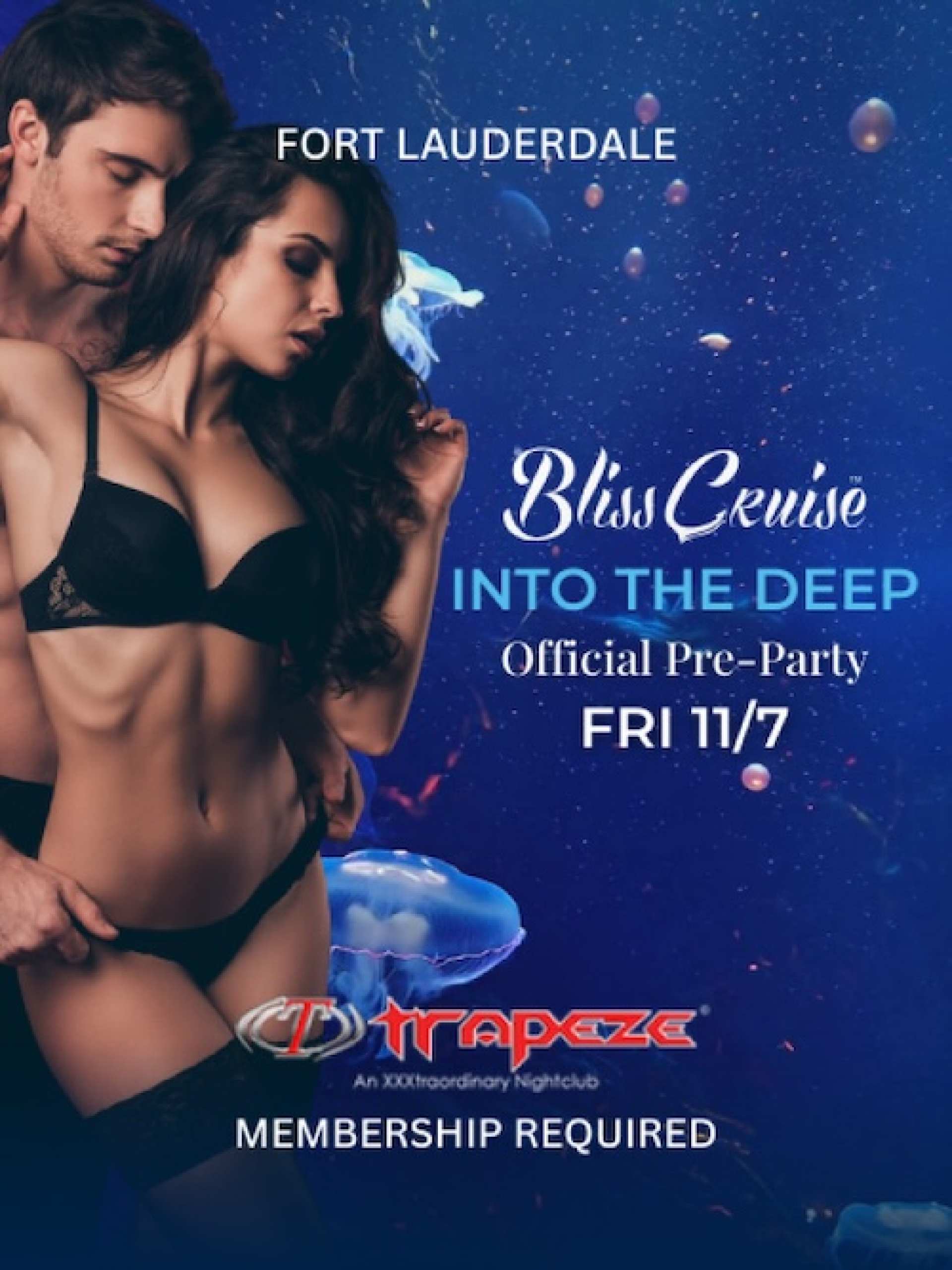 Friday, November 7th 8pm - 4am Before the ship sets sail, the party starts at Trapeze. Join us for the official Bliss Cruise pre-party and dive headfirst into a night of seduction, connection, and uninhibited fun. This is your chance to meet, mingle, and get wet before you even hit the ocean. Come out and play at South Florida’s best sex club! https://www.TrapezeClubs.com/Fort-Lauderdale *Membership to Trapeze required. Cannot be combined with other discounts or promotions.